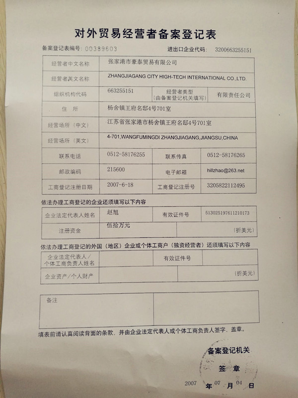 Export Company Name: | ZHANGJIAGANG CITY HIGH-TECH INTERNATIONAL CO.,LTD. |
